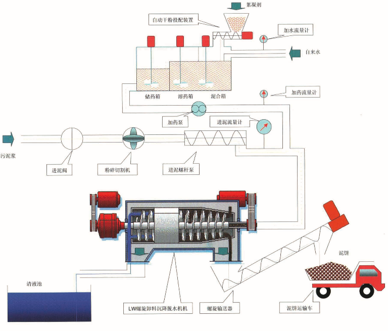 下圖為本公司制造的污泥脫水系統(tǒng)的主要設(shè)備和系統(tǒng)進(jìn)污泥脫水時(shí)的工藝流程,污泥脫水機(jī)的系統(tǒng)主要包括臥式螺旋卸料沉降離心機(jī)(主機(jī)),全自動(dòng)絮凝劑制備投加裝置,無軸輸送機(jī),污泥進(jìn)料泵,污泥粉碎機(jī),加藥泵,流量計(jì)和全自動(dòng)控制系統(tǒng)等。